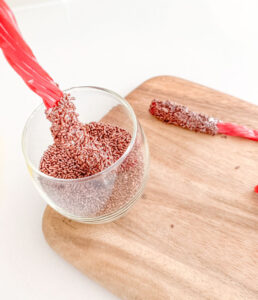 - Immediately after dipping, sprinkle the coated end with your choice of sprinkles, edible glitter, or colored sugar. Make sure to cover it properly to get the desired effect.